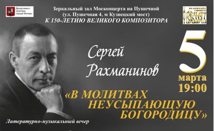 Мероприятие к 150-летию композитора, пианиста и дирижера состоится 5 марта в Зеркальном зале Москонцерта на Пушечной улице. Его проведет протоиерей Артемий Владимиров, который поделится размышлениями о судьбе Рахманинова, связи его музыки с традициями отечественного искусства.