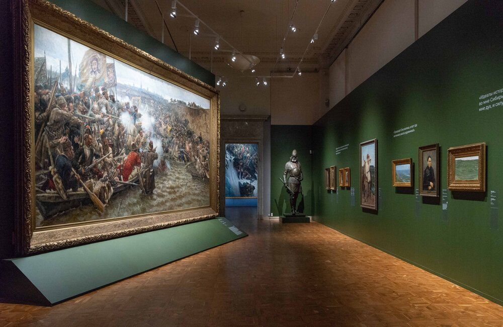 На выставке представлены более 120 работ из собраний Русского музея, Третьяковской галереи, Красноярского художественного музея, а также Музея-усадьбы Сурикова, Московской духовной академии, Московской галереи Ильи Глазунова. В экспозицию вошли такие шедевры, как «Переход Суворова через Альпы», «Покорение Сибири Ермаком», «Взятие снежного городка», «Степан Разин» и другие. Выставка работает до 10 июня.